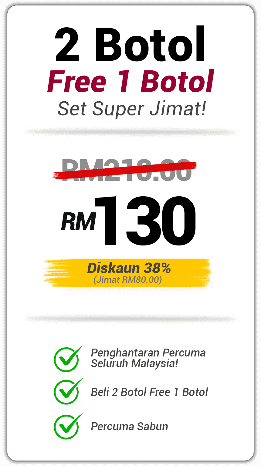 MAKLUMAN: Keberkesanan produk ini bergantung kepada kesesuaian individu. Setiap hasil dari penggunaan adalah berbeza bagi setiap individu. Produk ini akan memberi kesan sekiranya pengguna mengamalkan dengan cara yang betul berdasarkan banyak testimonial yang diperolehi. Kita berikhtiar, Tuhan yang menyembuhkan.